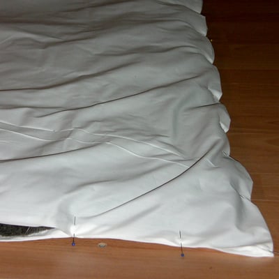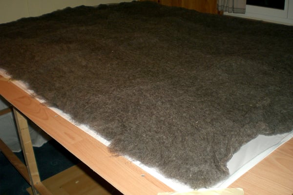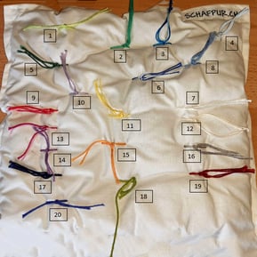 Die gereinigte und gekardete Wolle wird als Vlies bei uns in Handarbeit in herrlich feinen Baumwollstoff eingenäht. Damit das Vlies an Ort bleibt, wird es mit rund 80 Knöpfen aus Baumwollgarn festgehalten. Auf Wunsch dürfen Sie die Farbe des Garns wählen. Das Musterkissen mit den verfügbaren Garnfarben finden Sie weiter unten.